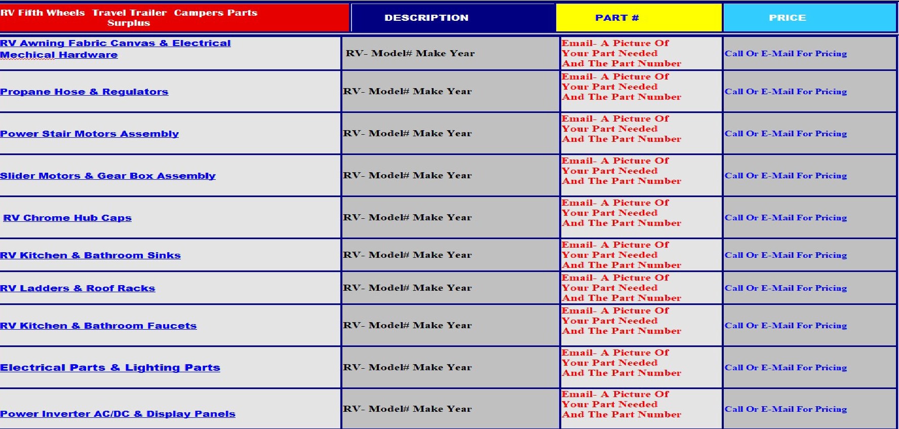 RV Parts specializes in New And Used RV Parts & Accessories. Operating